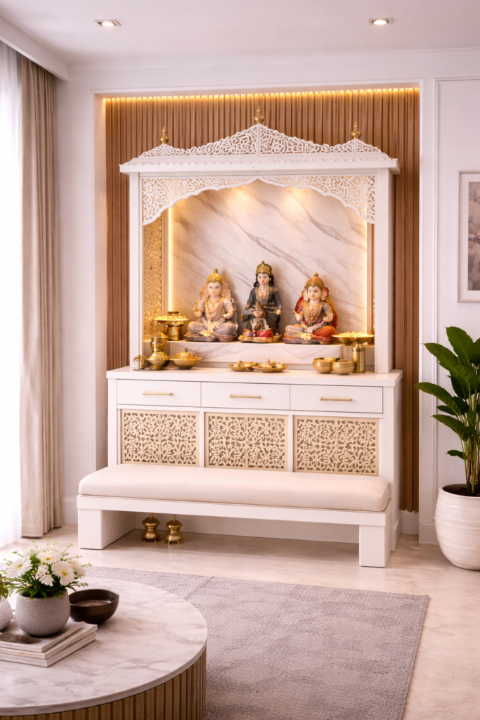 Beautiful designs that blend traditional temple aesthetics with modern interior styles.