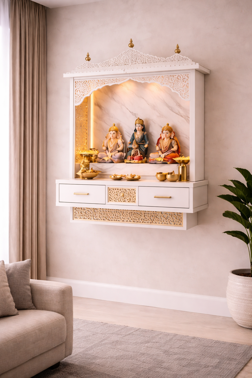 Space saving mandir designs that can be mounted on the wall, perfect for apartments and compact homes.