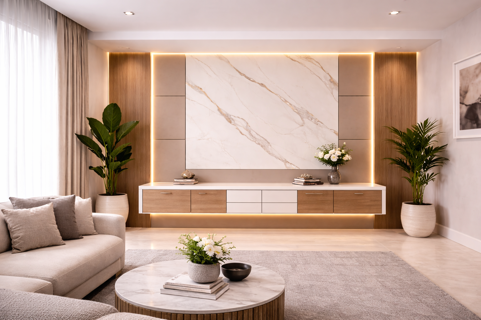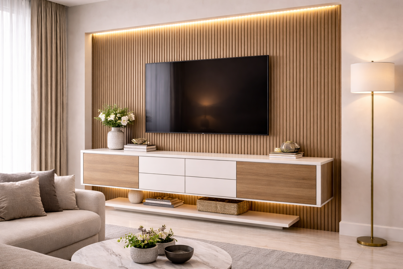 Custom paneling designed to enhance TV walls and living room feature walls.
