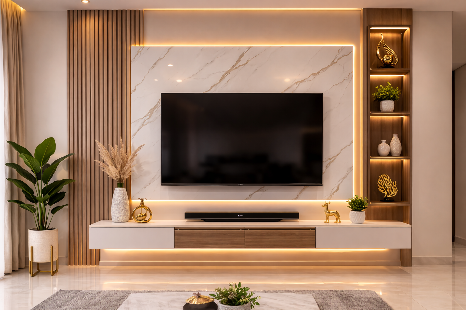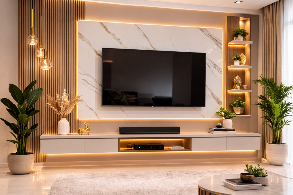 Custom paneling designed to enhance TV walls and living room feature walls.