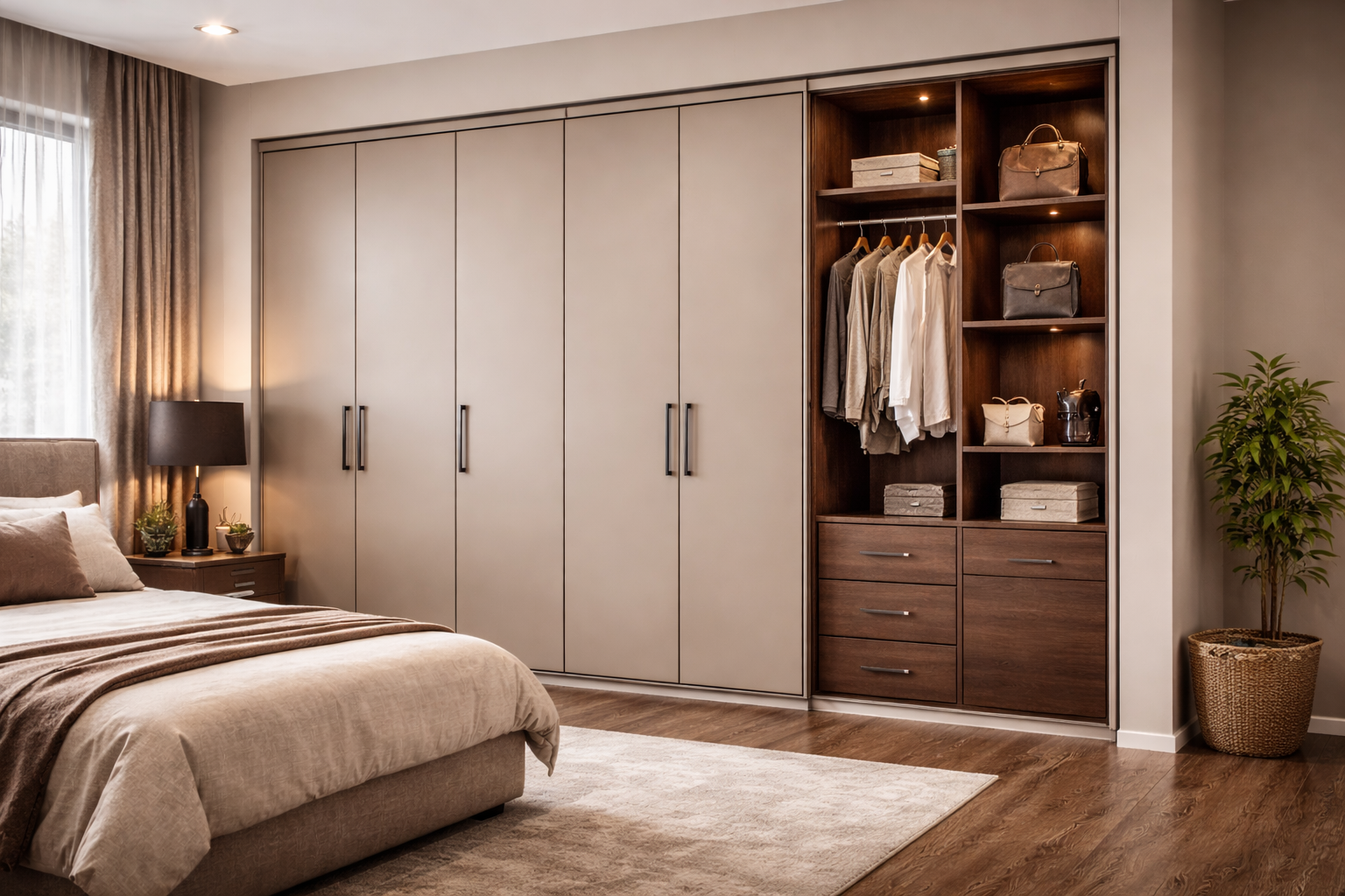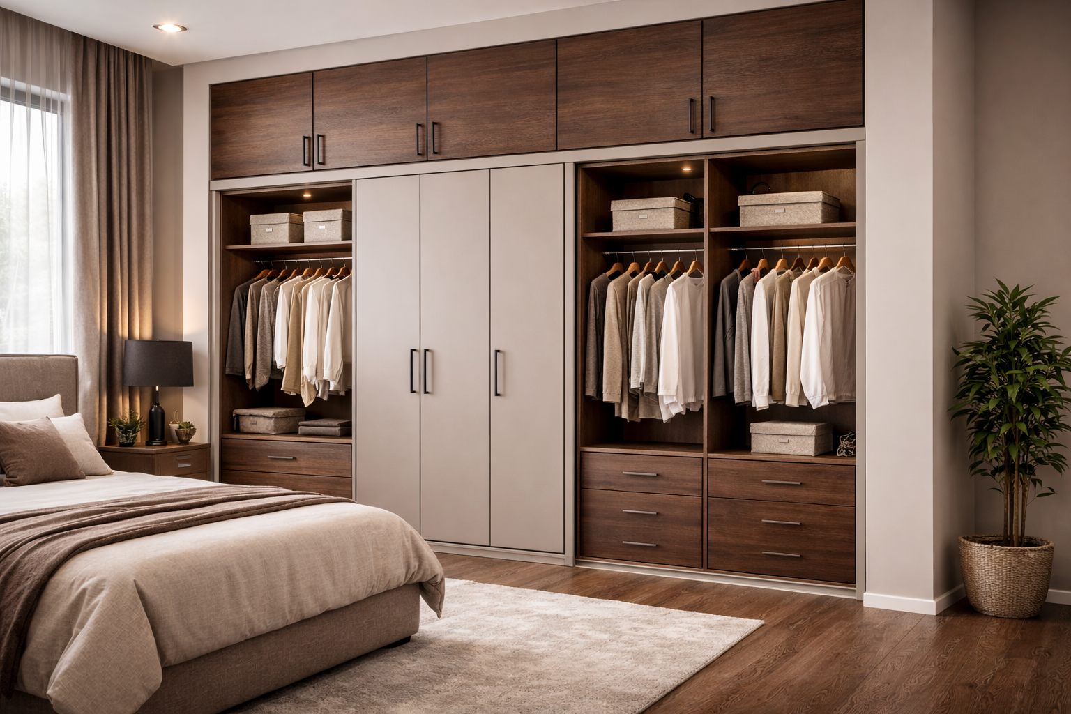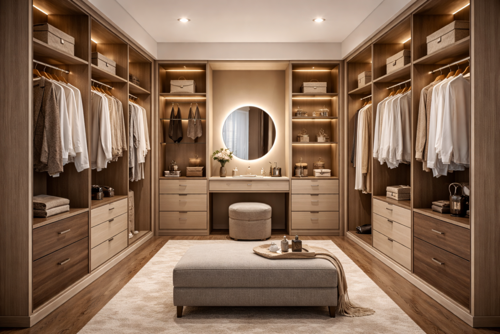 A luxurious wardrobe solution designed to maximize storage space while creating an organized dressing area.