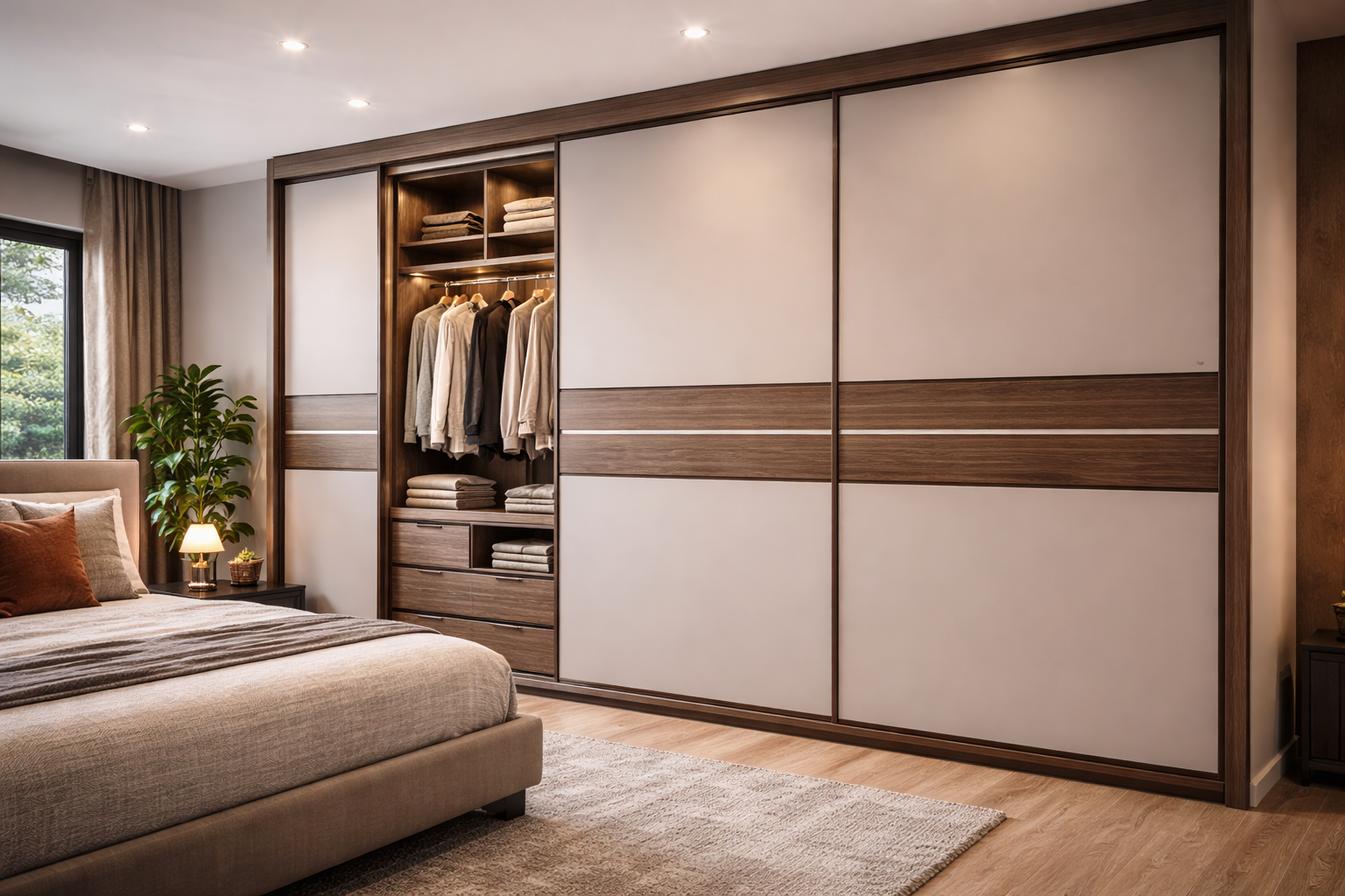 A space saving wardrobe design with smooth sliding doors, perfect for modern bedrooms.